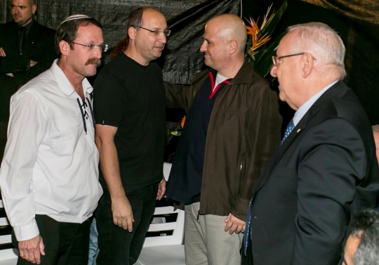 בעצרת "זוכרים את הרצח, נאבקים על הדמוקרטיה", מימין לשמאל: הנשיא רובי ריבלין, פסח האוספטר, אבי ניסנקורן מזכ"ל ההסתדרות ודני הירשברג מזכ"ל בני עקיבא