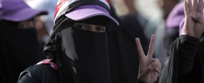 נערה מריעה לציון שלוש שנים להורדתו מהשלטון של עלי עבדאללה סלאח, צנעא, 2014