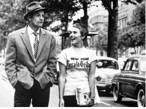 ג'יין סיברג כמקדמת מכירות של העיתון "הרולד טריביון" בסרטו של גודאר "עד כלות הנשימה", 1959